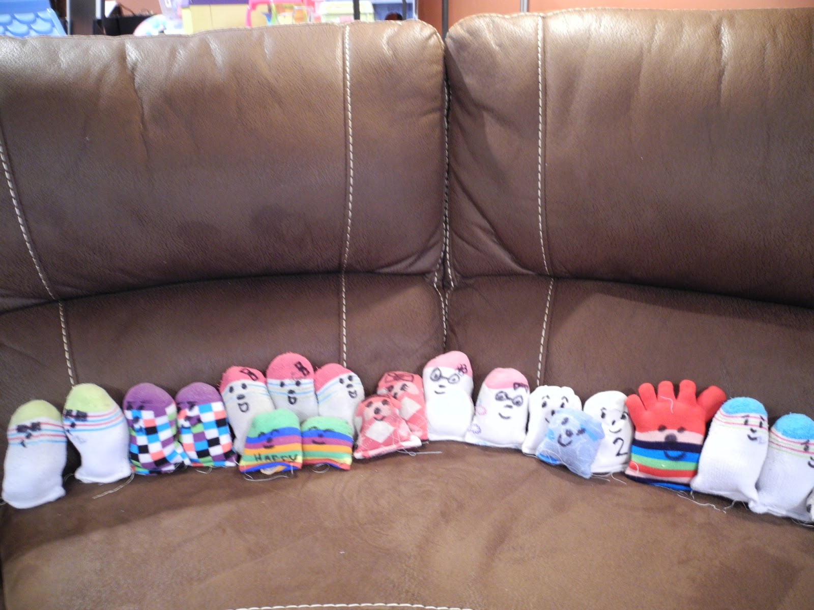 as I handed Jasmine her laundry pile I said"you could do a spring sock clean, if there's any with holes throw them out..."a little later I heard the sewing machine...this is what I found on the couch this morning...